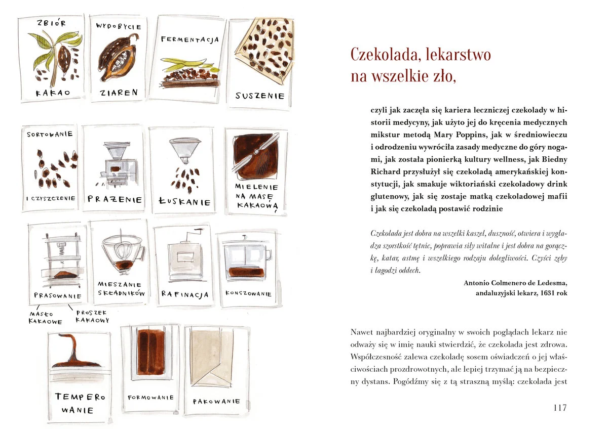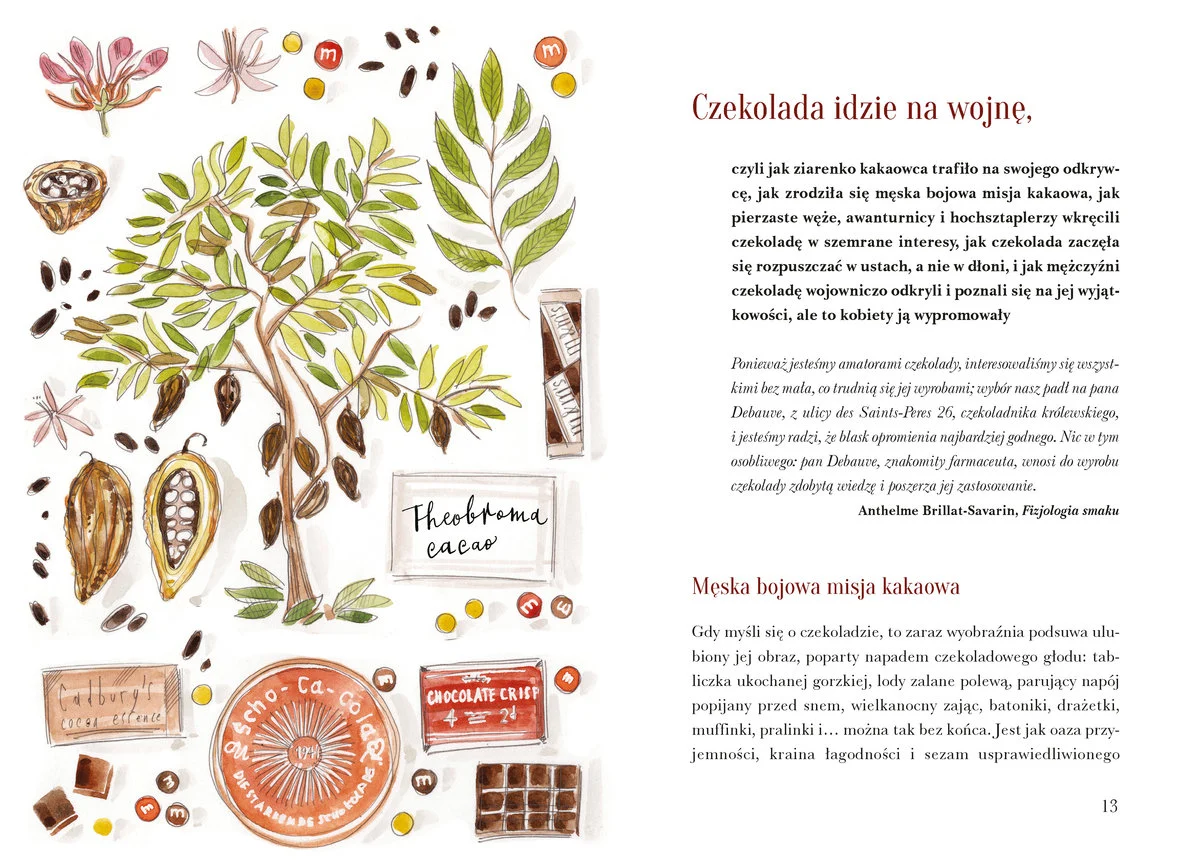 Wszystko to okraszone jest akwarelowymi ilustracjami czekolady. Wspomniane malunki są miłe dla oka, podobnie jak całe wydanie. Książkę przyjemnie się trzyma w ręku, papier ma ciepłą barwę, typografia jest wygodna i przyjazna. Czekoladę zaprojektowano z myślą o długiej, niespiesznej lekturze. Podczas czytania aż się prosi jednak o fotografie wspomnianych dań, technologii, miejsc czy osób. Kiedy czytelnik już da się wciągnąć, zasiądzie w fotelu i starannie wtopi w poduszki, nagle może odczuć przymus oderwania oczu od książki i wystukania pytania w wyszukiwarce, na przykład jak wyglądają owe słynne etykiety czekoladek czy torebka. A jest tego mnóstwo! Czekolada, jak się okazuje, sama w sobie ma ogromny wpływ na rozwój ludzkiej cywilizacji.