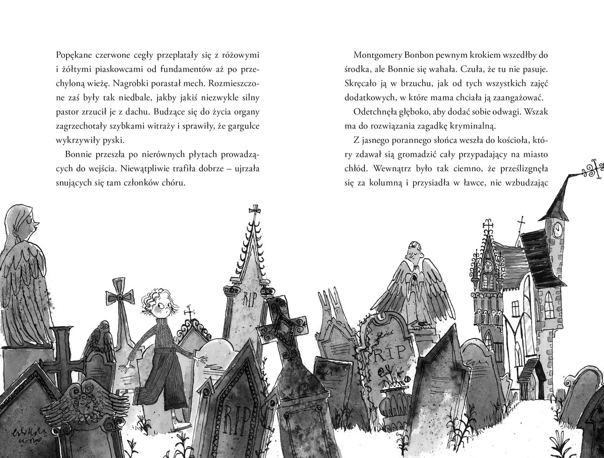 OK, OK, już wiemy, że jest ciekawa, ale… o czym jest książka? Główną bohaterką jest bystra i niesztampowa dziewczynka, lat 10. W towarzystwie swojego dziadka Banksa rozwiązuje sprawę morderstwa w (a jakże!) w muzeum. I kradzieży. Przypadek sprawił, że akurat w chwili popełnienia przestępstwa była na miejscu zdarzenia. Natychmiast wcieliła się w swoje alter ego: detektywa Montgomery’ego Bonbona. Pomaga jej to w wykrzesaniu z siebie większej śmiałości i dodaje pewności siebie w myśleniu, a także sprawia, że inni uczestnicy wydarzenia traktują ją poważniej (tematy warte przegadania z młodymi czytelnikami!).