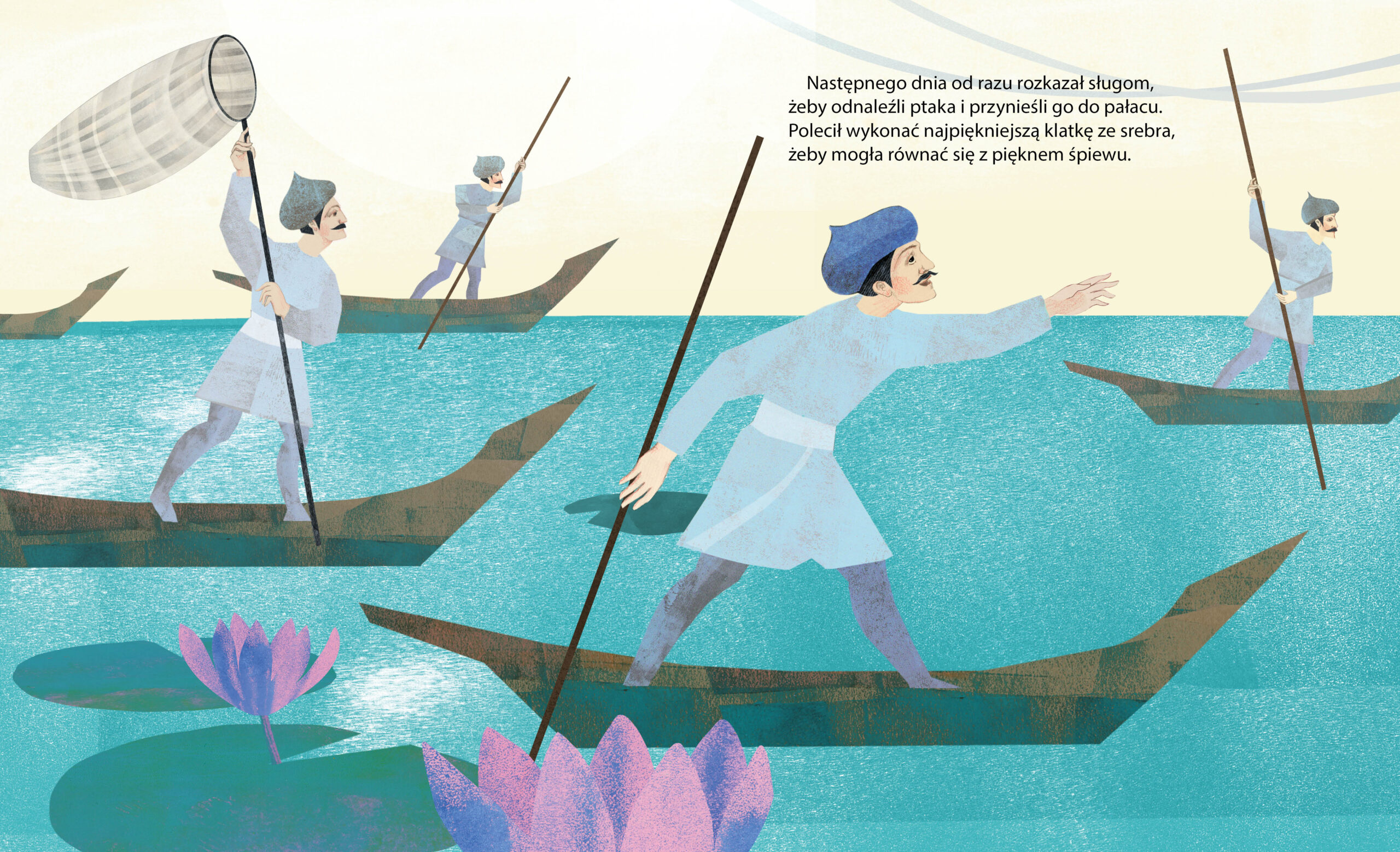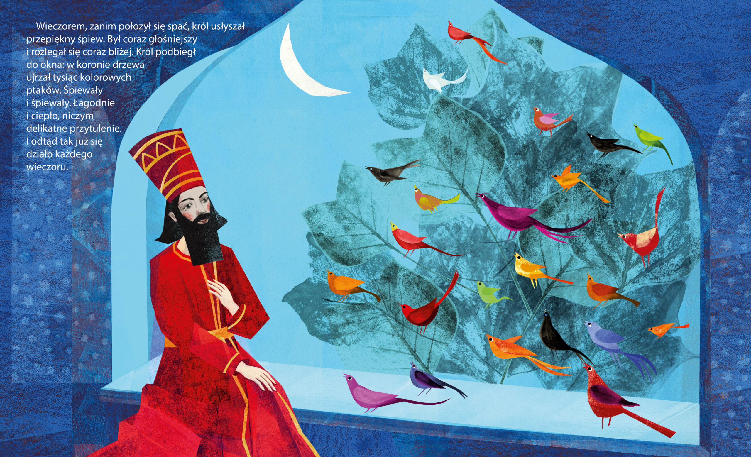 Baśń rozpoczyna się od królewskiego zachwytu nad śpiewem ptaka. Pragnie, aby ten towarzyszył mu w pałacu, jednak po zamknięciu w klatce (a jakże, złotej) – ptak milknie. Król rozkazuje sprawadzać dla niego coraz liczniejszy zastęp towarzyszy, jednak pomimo tego (i zwiększenia klatki) ptaki milczą. Oczywiście w pobliżu mieszka chłopiec, którego zwierzę śpiewa cudne pieśni (pomimo tego, że ma nijaką klatkę i jest sam jeden). Finał? Piękny, chociaż nie jest tak, że nie można się go domyślić. Z jednej strony wydaje się, że sama fabuła stanowi połączenie wielu wątków przewijających się w znanych i lubianych bajkach, bohaterowie też archetypami. Jednak! Sposób skonstruowania fabuły Tysiąca ptaków i jej bohaterów to świetny sposób na to, aby zabawić się nie tylko w baśniowego filozofa, ale też detektywa i kulturoznawcę. Możemy razem odnajdywać to, co znane i lubiane, stworzyć razem galerię baśniowych postaci, opowiadać bajkę z różnych perspektyw… Jest to książka idealna do tego, aby się nią bawić na wiele sposobów, w zależności od naszych potrzeb czy chęci.